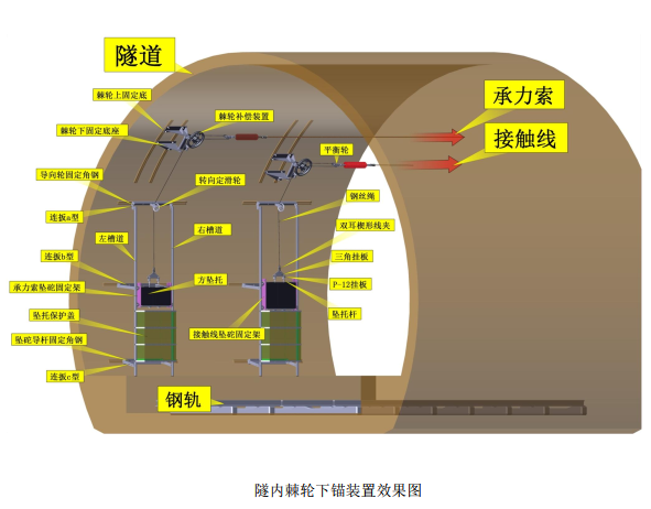 隧內(nèi)棘輪下錨裝置是隧道內(nèi)接觸網(wǎng)線索張力自動補償裝置的一種, 實現(xiàn)接觸網(wǎng)在隧道內(nèi)的機